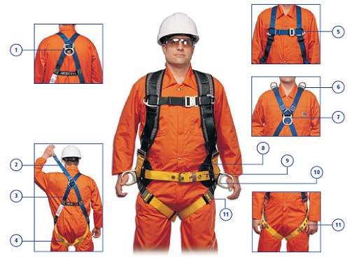 1、墜落防護連接點。2、D形環(huán)延長帶。3、向上箭頭指示。4、腿帶。5、胸帶。6、肩部D形環(huán)。7、胸部D形環(huán)。8、腰部支撐。9、腰帶。10、側面D形環(huán)。11、腿部連接。